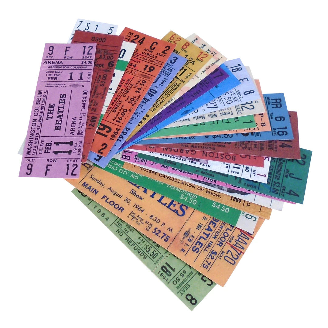 - The set includes twenty-five ticket replicas from the Beatles First American Tour in 1964.