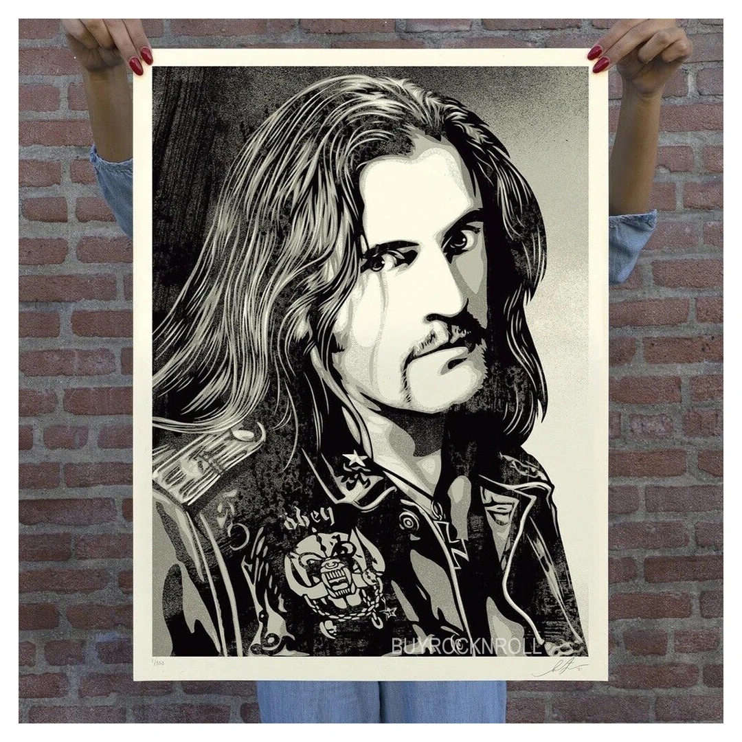 Lemmy Damaged Case. 18 x 24 inches. Screen print on thick cream Speckletone paper. (c) 2021 Motorhead and Original photograph (c) Tony Mottram. Signed by Shepard Fairey. Numbered edition of 550.
