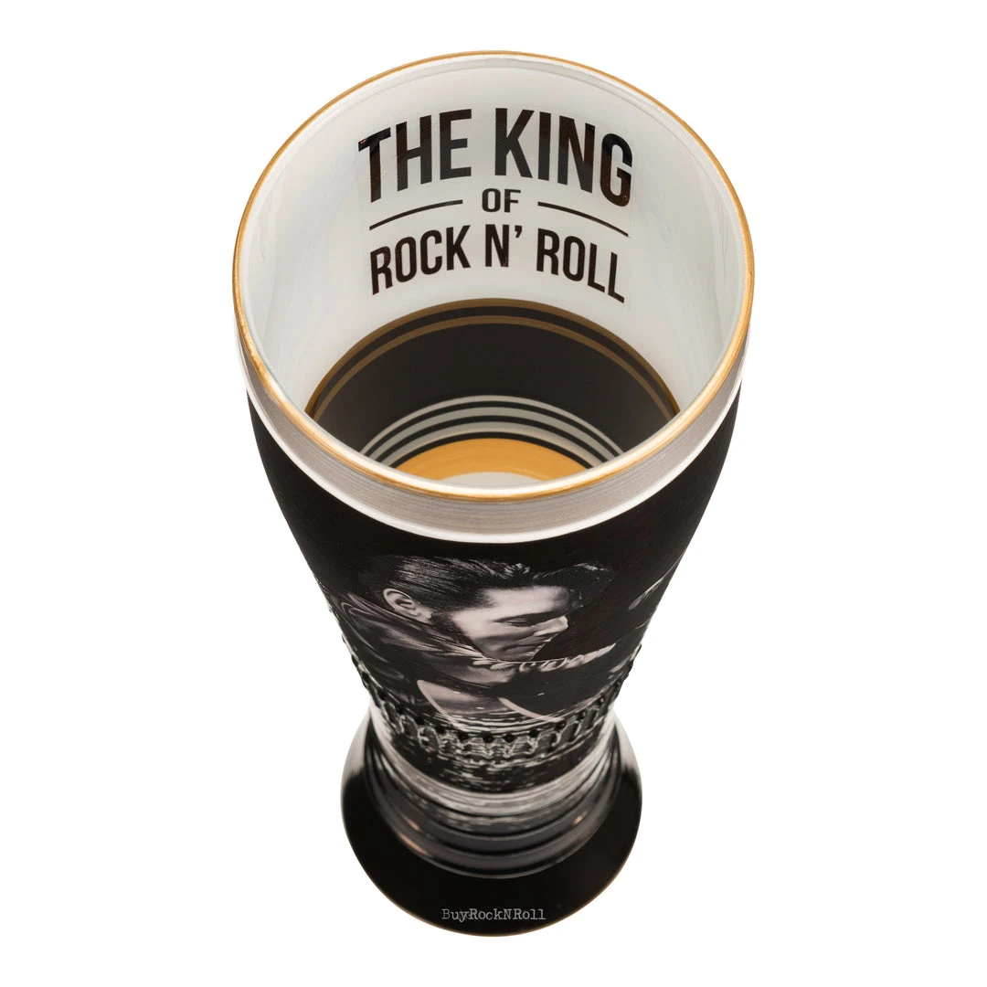 The Elvis Presley King of Rock and Roll Hand Painted Glass features Elvis Presley playing guitar and holds up to 20 ounces of liquid with the words “Elvis Presley.” This collector’s pilsner glass has been hand-painted and hand-crafted and features an amazing image on the inside using a multi-dimensional ReverzArt technique, which uses no paint on the inside of the glass.