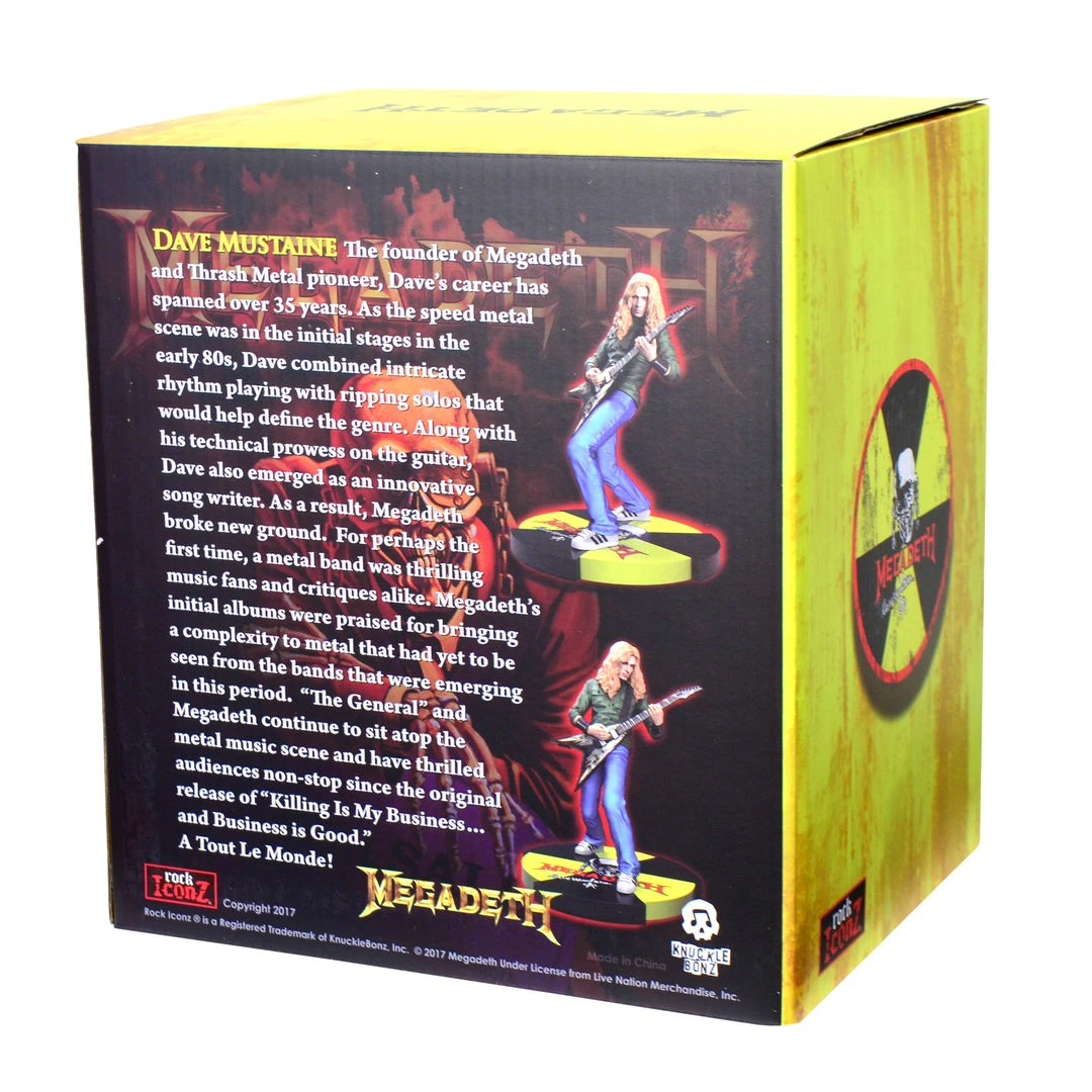 Dave Mustaine is the legendary frontman of the thrash metal band, and he is featured in his green shirt, blue jeans, and sneakers atop a Megadeth radioactive-themed base. The 9” statue is cast in poly-resin and hand-painted in tremendous detail by a team of highly skilled artists, creating a remarkable likeness to Dave.