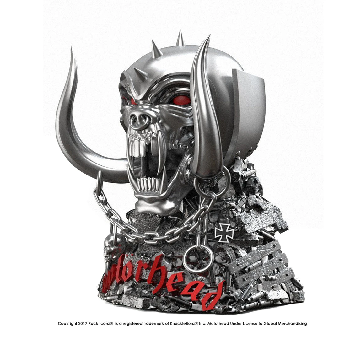 Loud, fast, and thrash defined the legendary English rock band, Motorhead, to their legion of fans throughout the world. The Motorhead Warpig is the band’s distinctive logo that appeared on their first Motorhead album and also on ensuing albums in different variations. The Warpig statue is cast in polyresin and features Snaggletooth’s iconic look on top a Motorhead logo base.