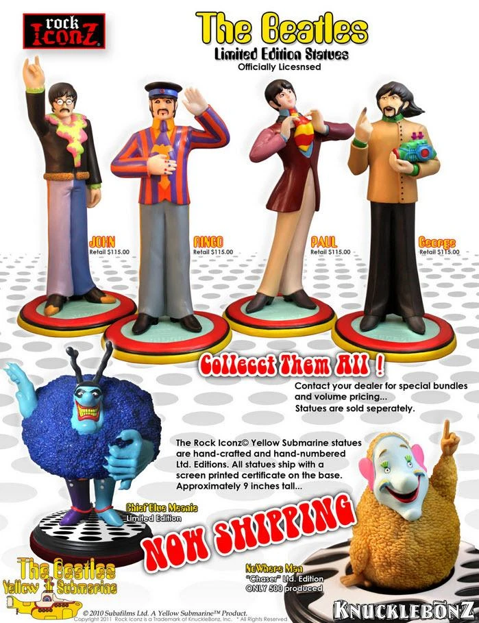 In November of 2011 KnuckleBonz unveiled a series of limited edition statues in their Rock Iconz® Series representing characters from the animated film classic The Beatles, Yellow Submarine. These collectibles are licensed and approved by Apple Corps, Ltd.
