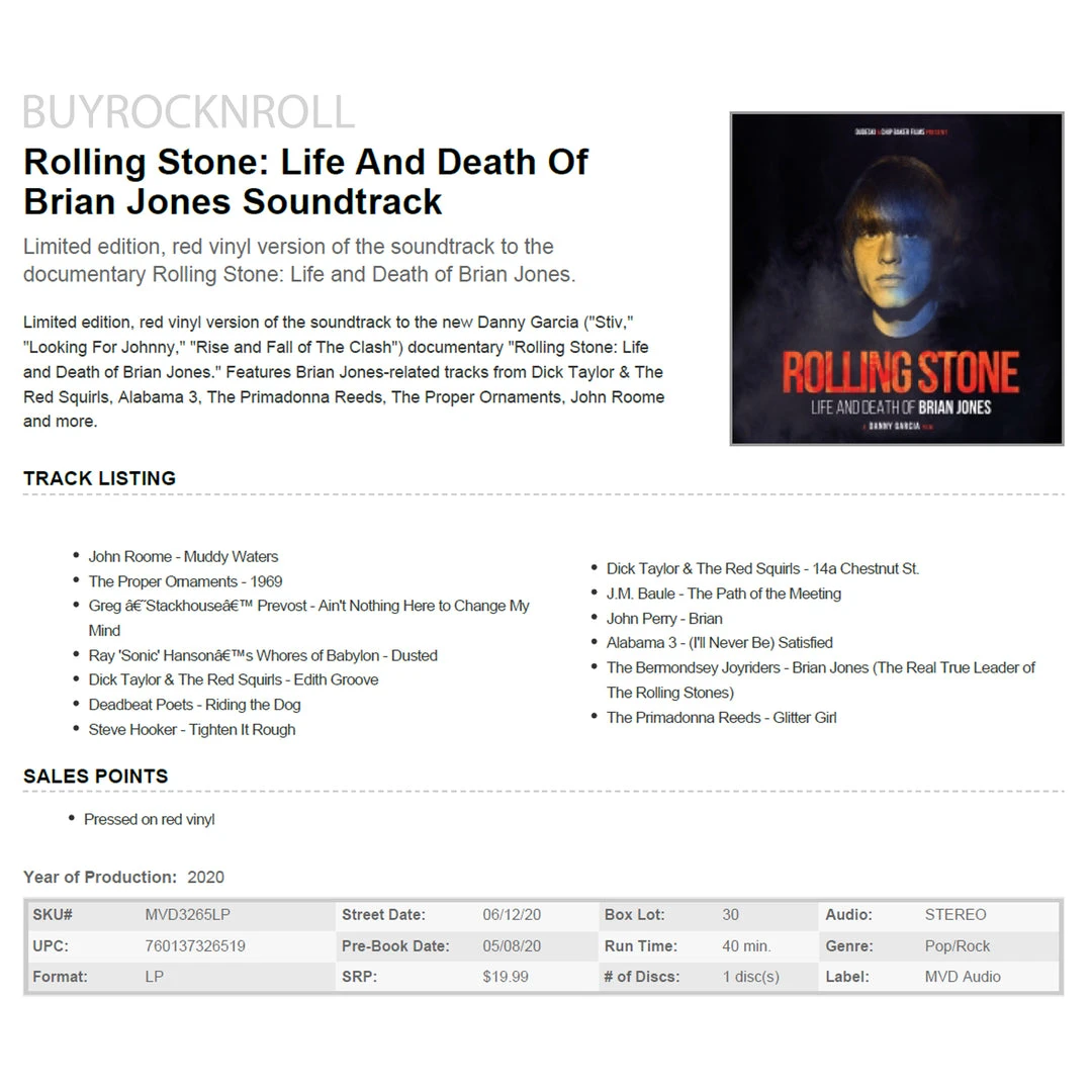 Limited edition, red vinyl version of the soundtrack to the new Danny Garcia (“Stiv,” “Looking For Johnny,” “Rise and Fall of The Clash”) documentary “Rolling Stone: Life and Death of Brian Jones.” Features Brian Jones-related tracks from Dick Taylor & The Red Squirls, Alabama 3, The Primadonna Reeds, The Proper Ornaments, John Roome, and more.
