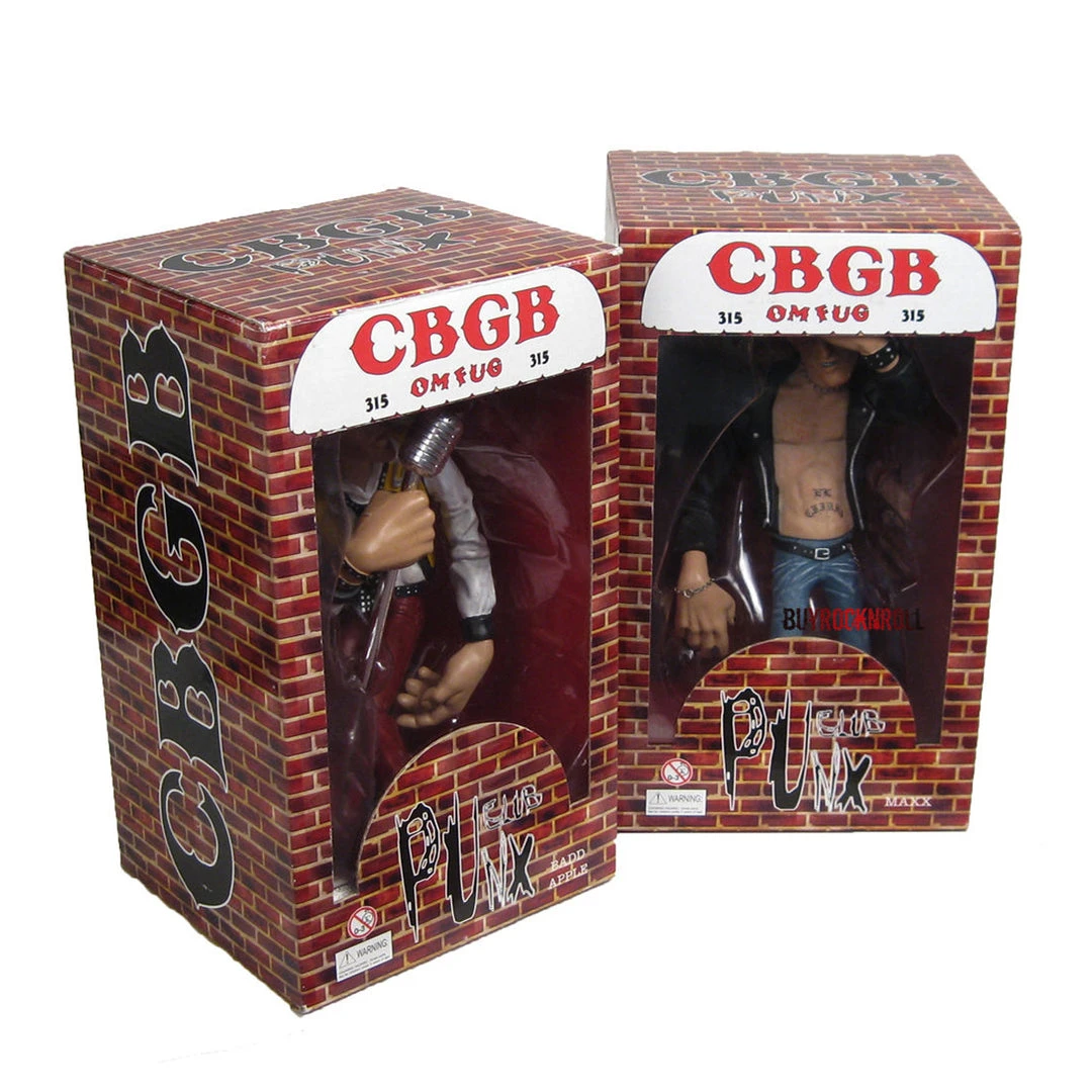 The rare and highly collectible CBGB Punx action figures are replicated to represent the good old days of 315 Bowery New York, NY 10003 the staple of NYCs Punk and Hardcore scene. Featuring fictional punk pioneer characters Maxx and Bad Apple.
